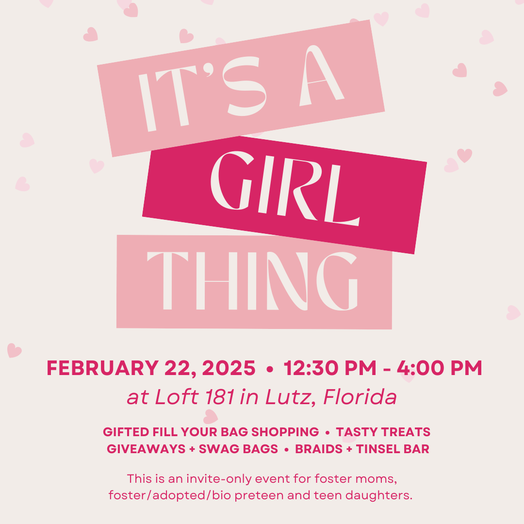 It’s A Girl Thing is a special day created just for foster moms and their preteen and teen foster, adopted and bio daughters ages 10 to 17. This experience is all about connection, confidence, and fun. Girls get to shop, snack, get pampered with hair braiding and tinsel, and enjoy giveaways, while moms are celebrated too with thoughtful touches just for them including a new bra (because we know it has been a minute) and other nifty gifties!